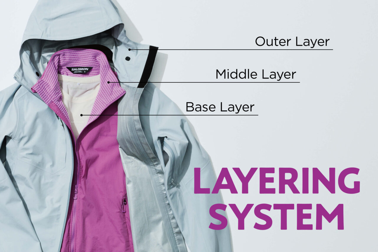 こうした環境に柔軟に対応するための基本が、ベースレイヤー(=汗を素早く逃がす肌着)、ミドルレイヤー(=保温を担う中間着)、アウターレイヤー(=風雨を防ぐ外側の殻)という三層構造です。これらを状況に応じて足したり引いたりしながら、「夏から冬までをカバーできるレイヤーを、ひとつの登山の中で用意する」ことが重要だと言えるでしょう。